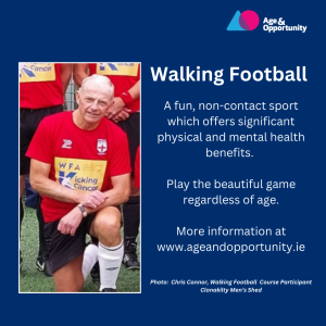 You can find out more about Walking Football courses by visiting our website www.ageandopportunity.ie or take a look at our video to find out what it’s all about here: https://www.youtube.com/watch?v=sg4FUi9_Tzc